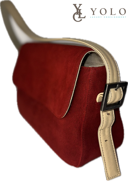 in Beige Nylon Canvas and burgundy suede with silver toned hardware
