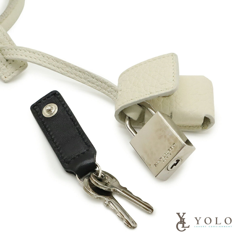 Considered a "Signature" Saint Laurent bag, this petite-sized purse features the sophisticated sleek shape, accordion sides, tubular leather handles, as well as a long leather shoulder strap. This particular bag is crafted out of stunning ivory calfskin leather and also has a silver metallic leather embossed Saint Laurent signature at the center. The beauty in this bag is surely in its simplistic nature.