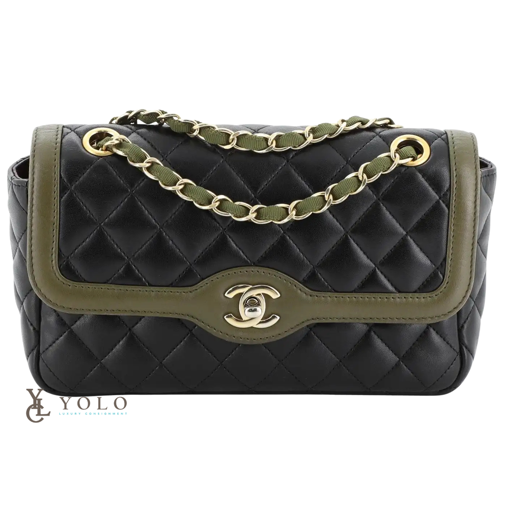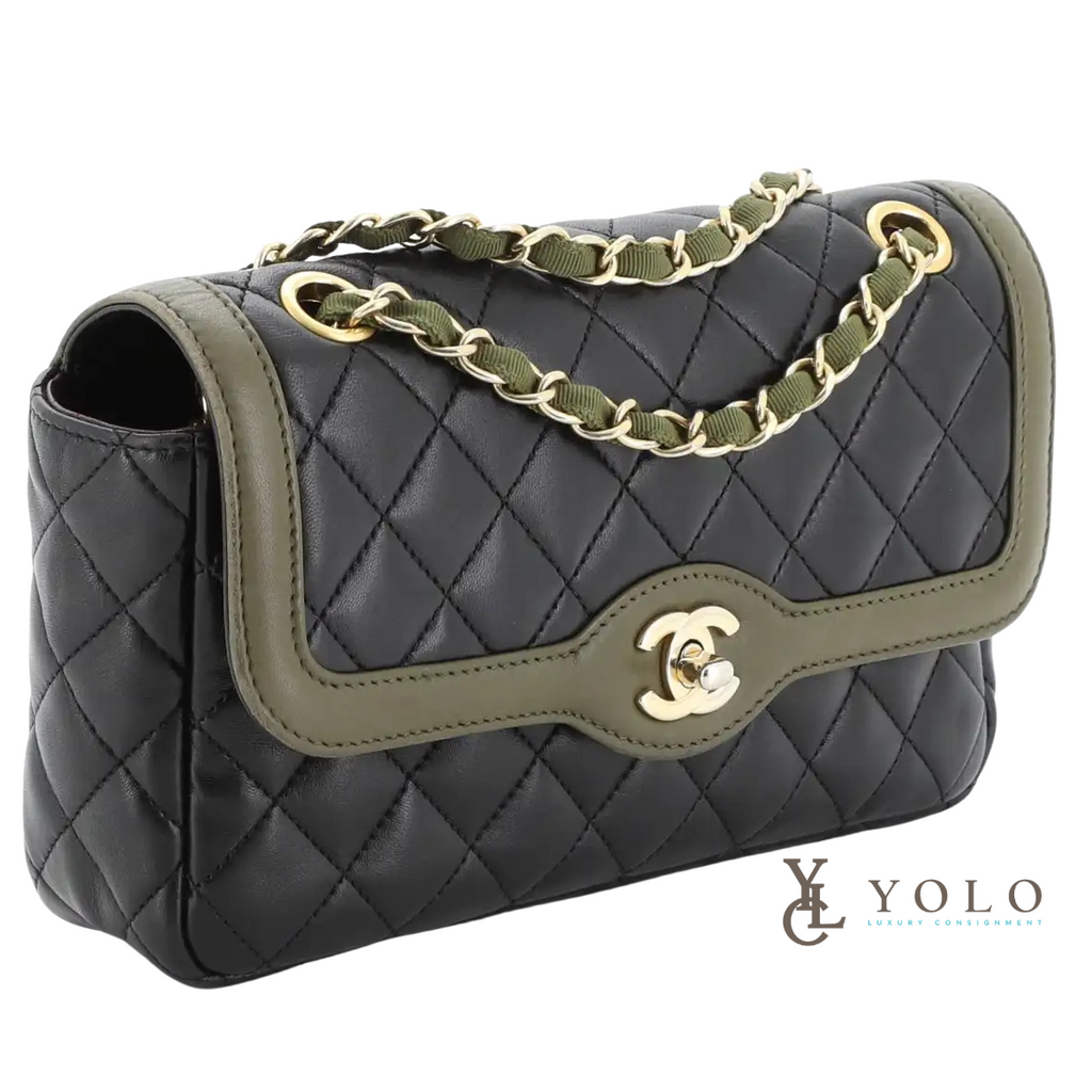 in Black Quilted Lambskin with Olive leather trim and Gold Toned hardware