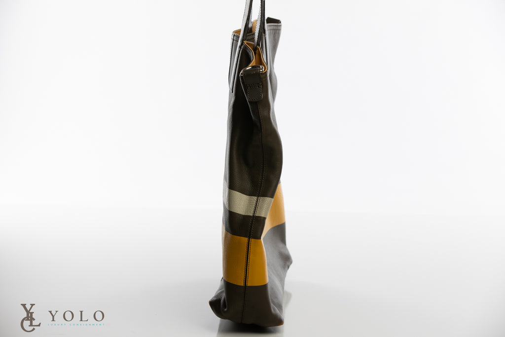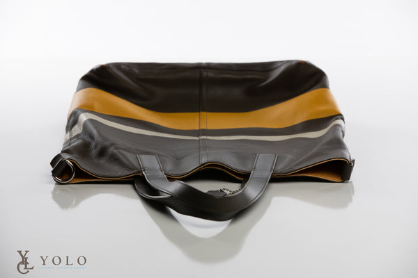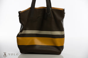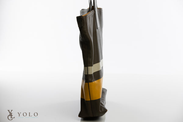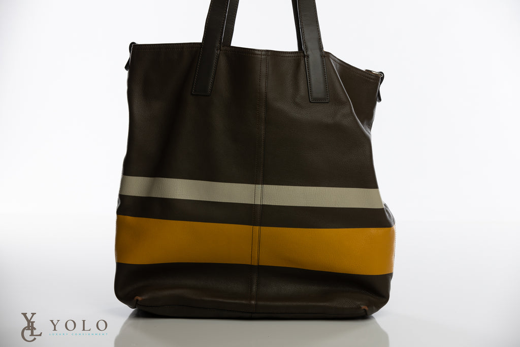 in Olive Leather reverses to Mustard Yellow Canvas with Olive Tonal trim and Silver toned hardware