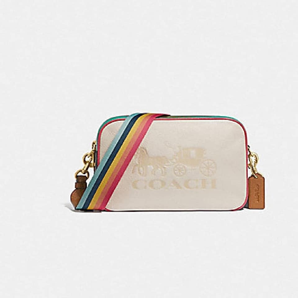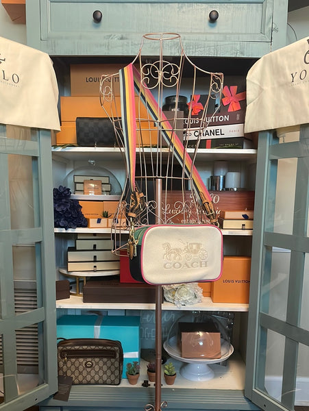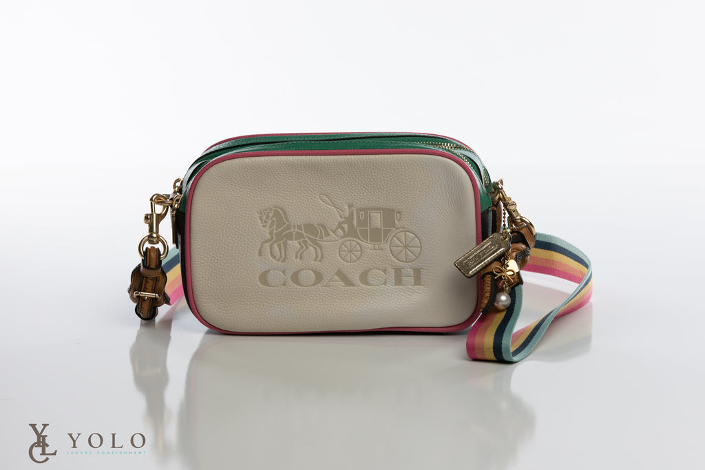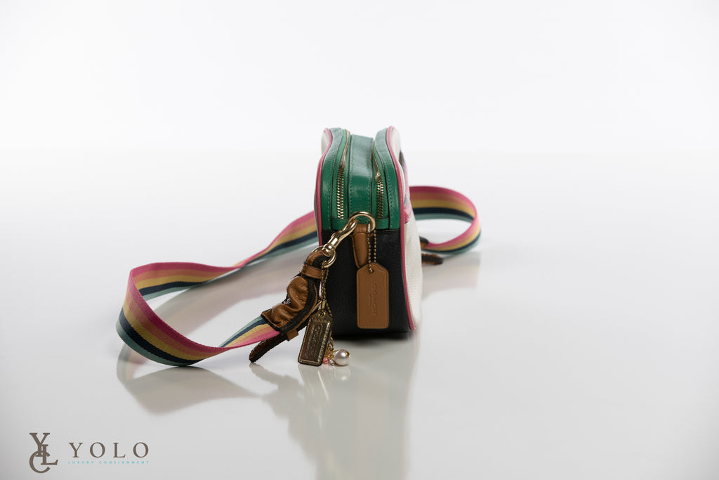 Features: Secure top double zip closure, exterior back slip pocket. Rainbow web crossbody strap. Interior double compartments and one multifunction slip pocket. Classic Coach hangtag.
