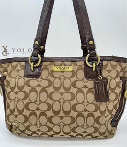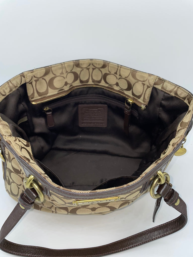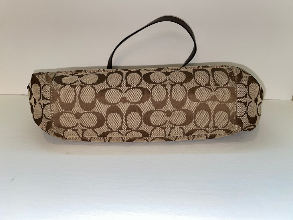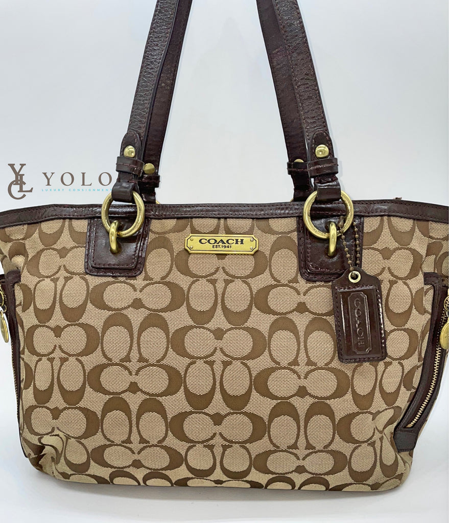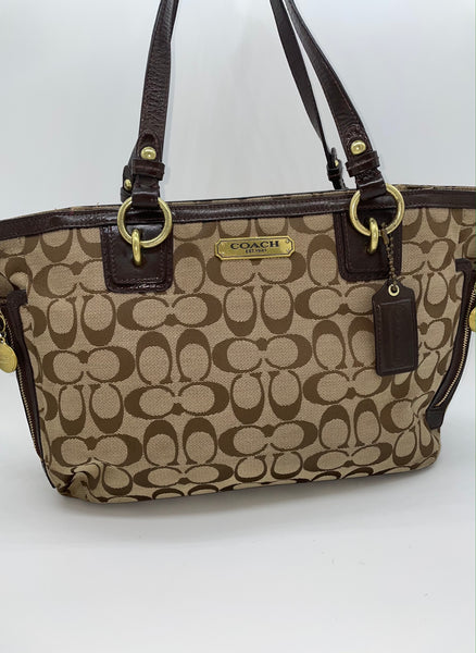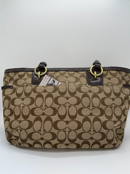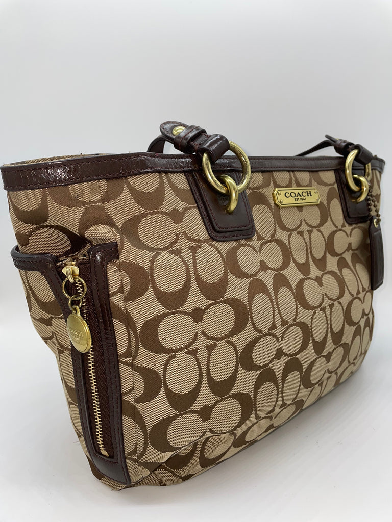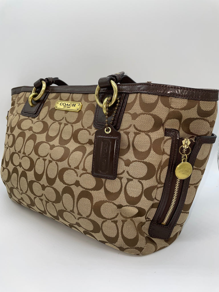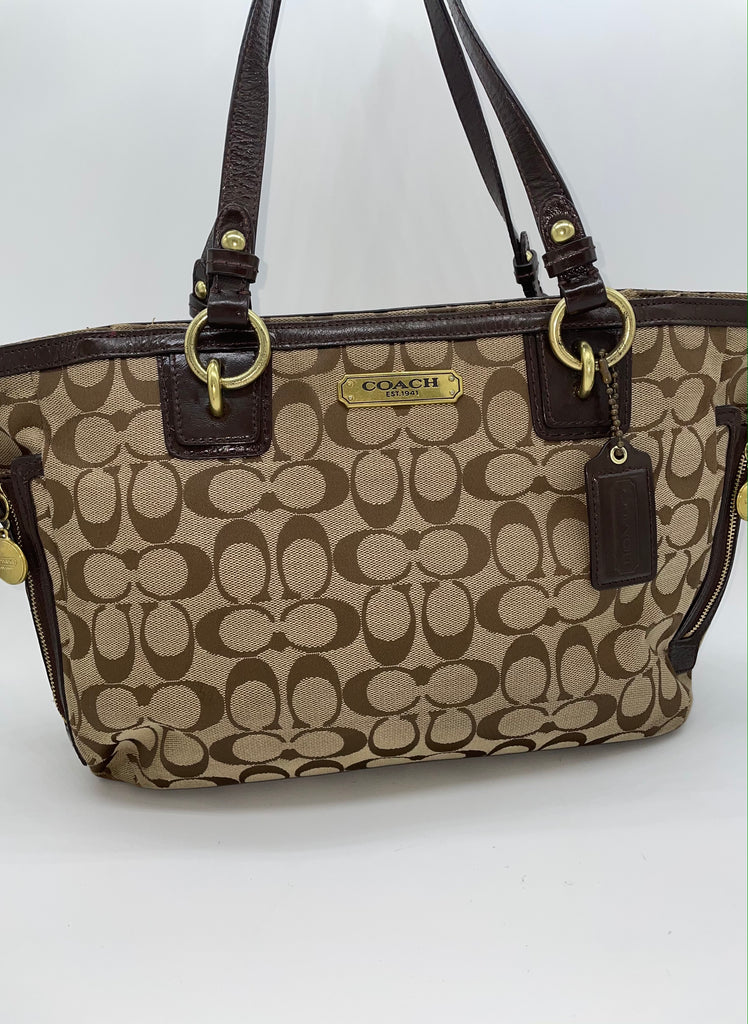 Tote features: secure top zip closure, dual shoulder handles, and three exterior pockets for ease of access. Interior has two multi-function slip pockets, and one zippered pocket. Classic Coach Hangtag.