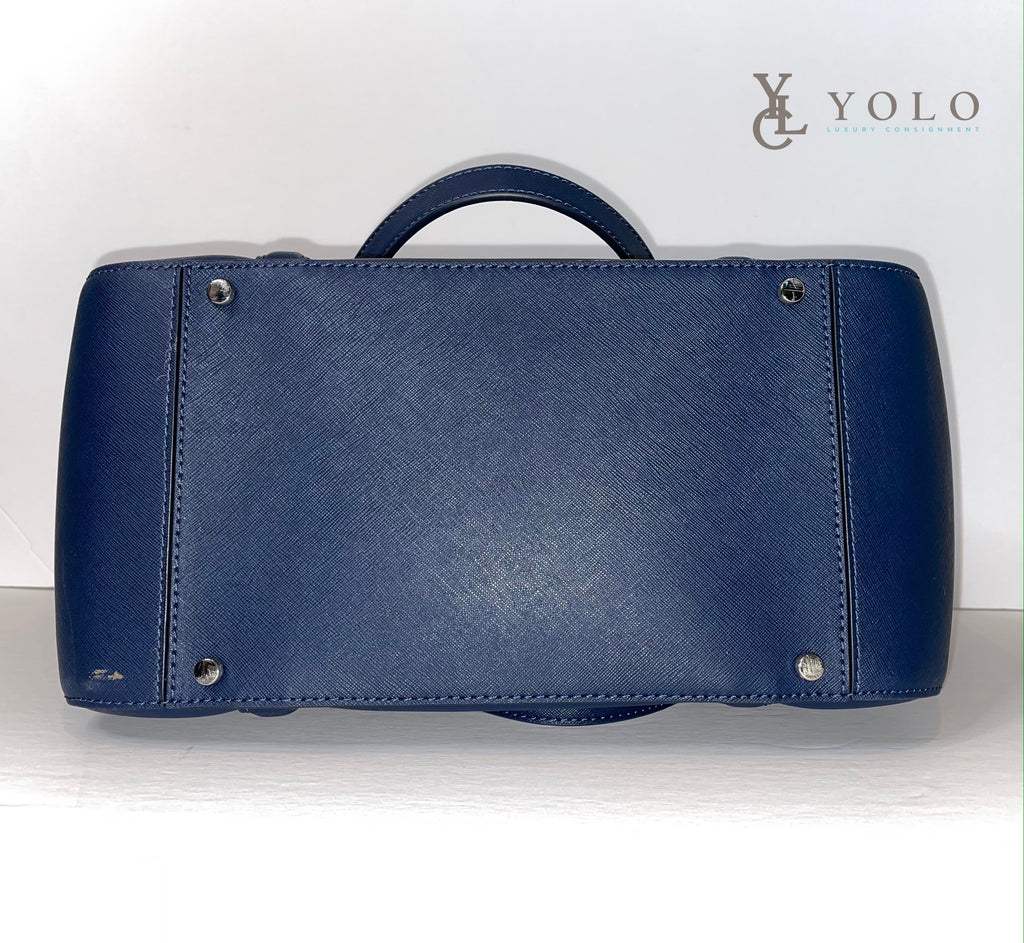 in "Nightcap" Navy Saffiano Leather with silver hardware