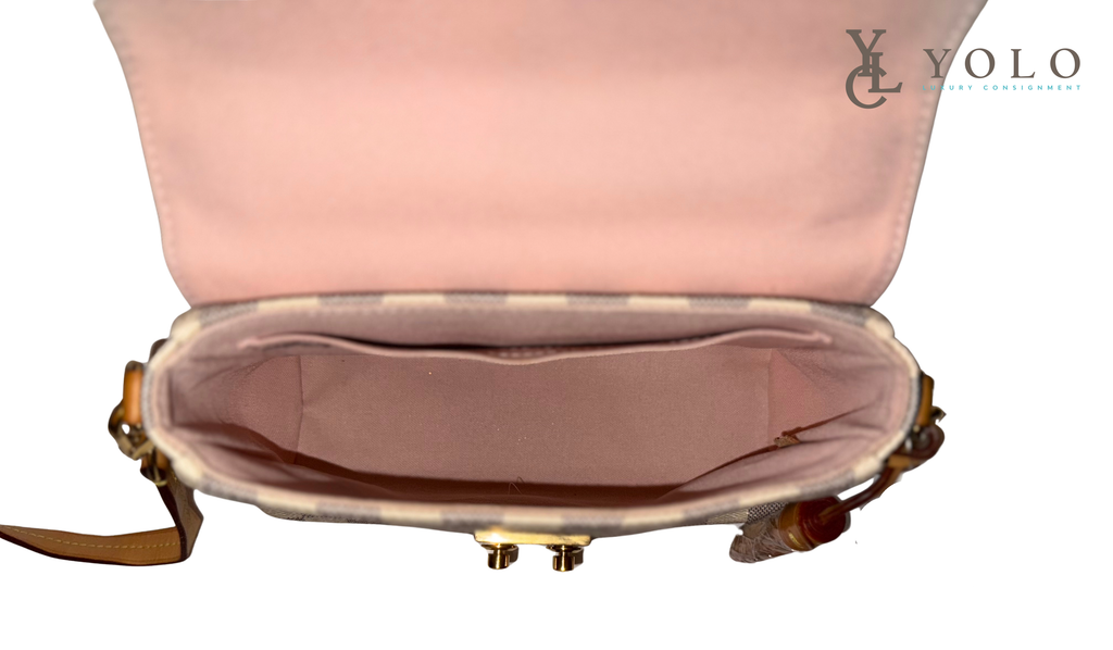 Damier Azur coated canvas with Natural Vachetta leather trim and Gold Toned brass hardware