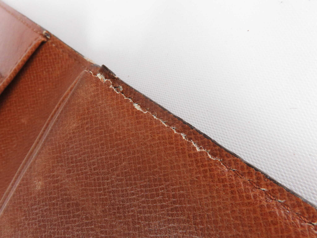 Condition Detail: Interior gusseted pocket has tear on right side that extends approx hald way down (pocket it still functional) and very small tear on left side approx 1/2 inch. Corner on the bifold shows some wear, interior shows some wear and minor faded spots. Exterior looks fabulous and this piece has a lot of life left!