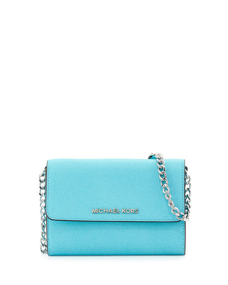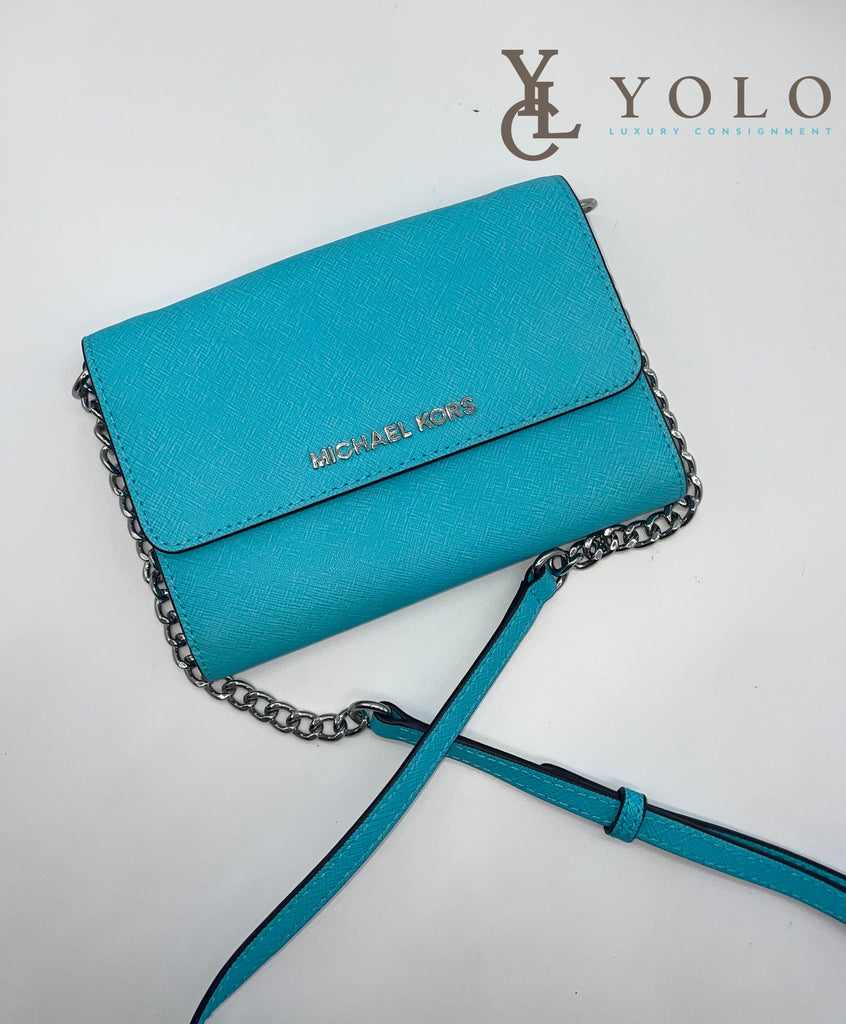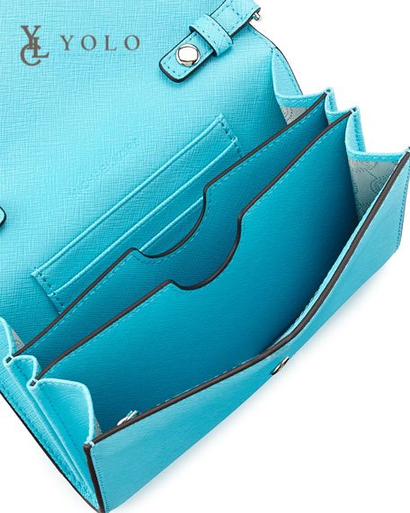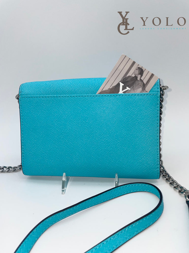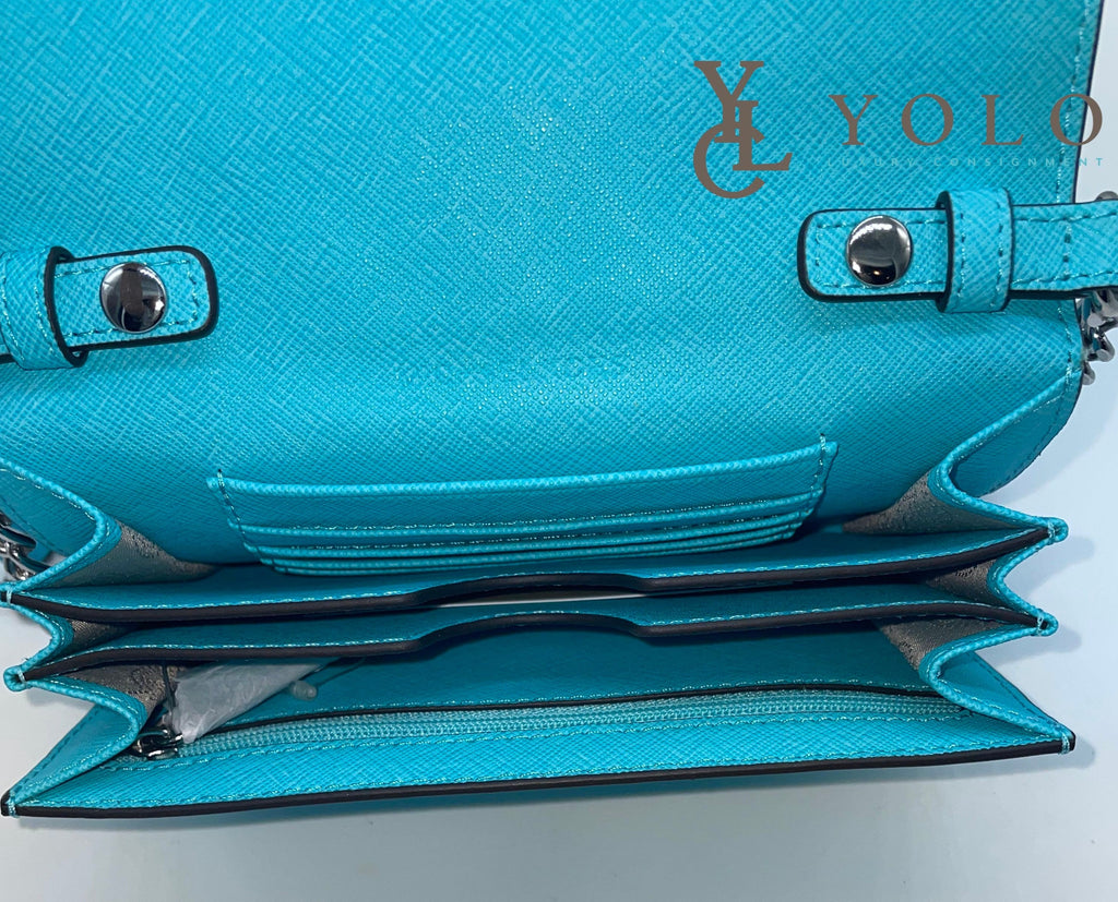 in Aquamarine Blue Saffiano leather with silver toned hardware