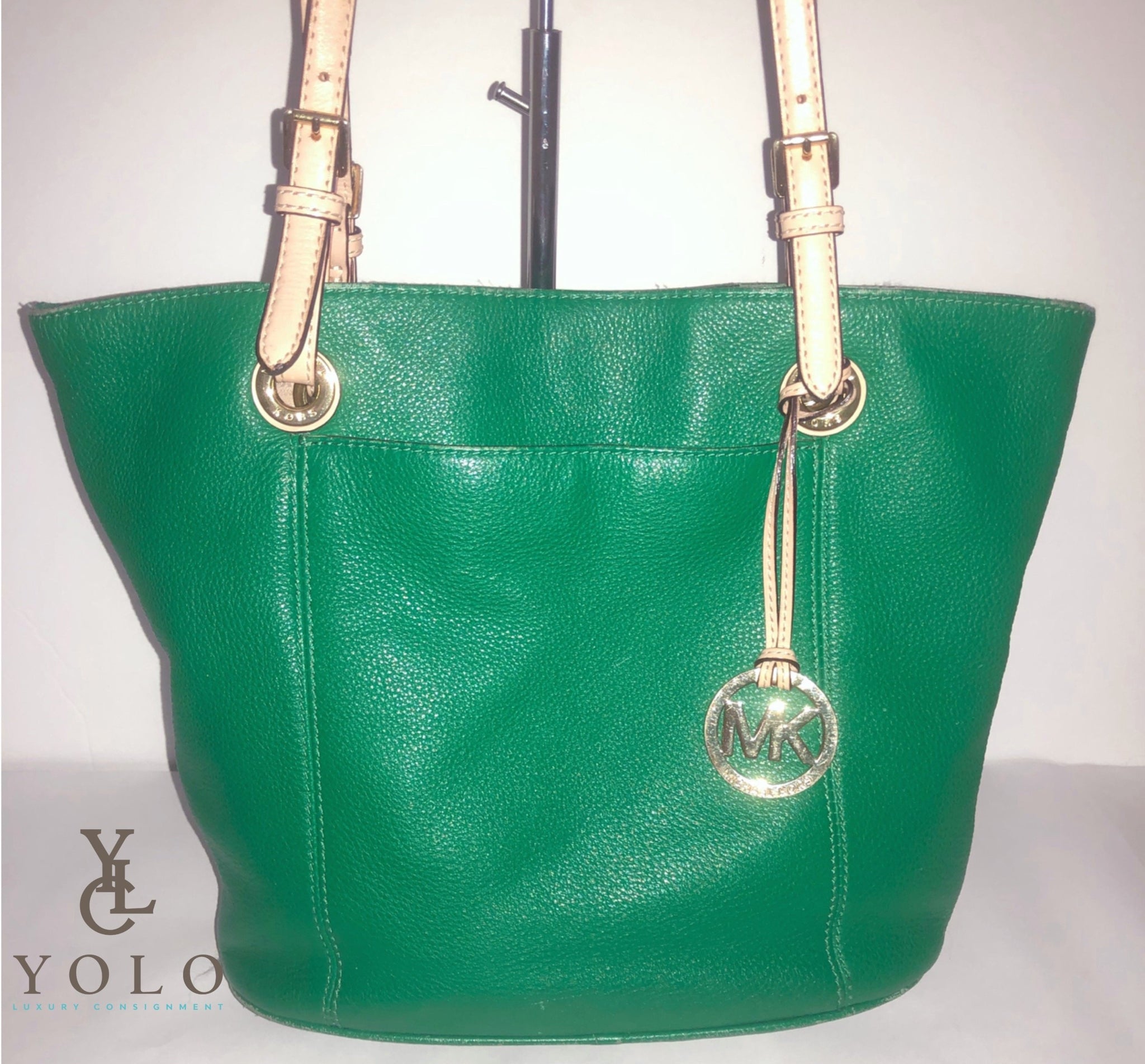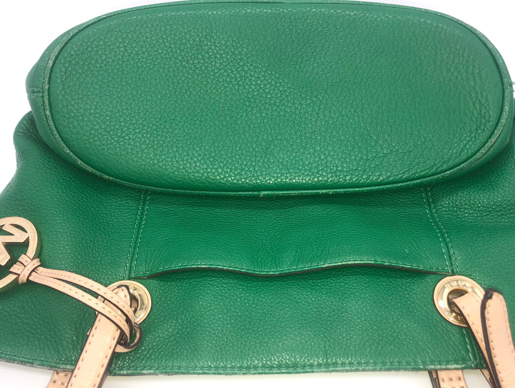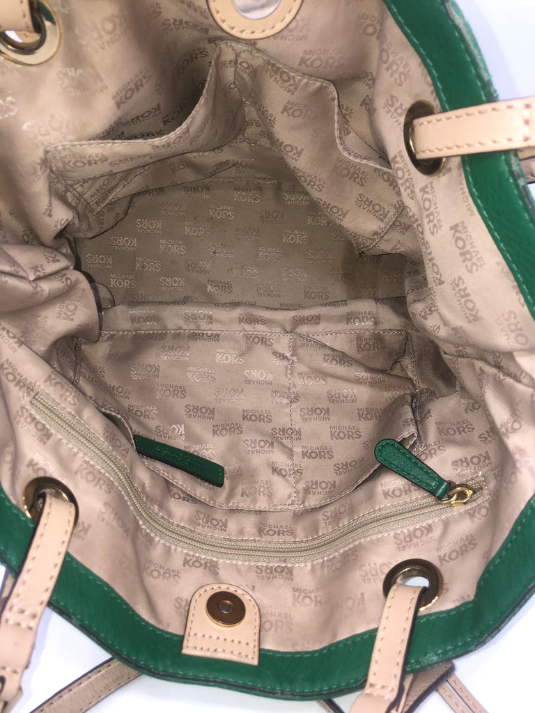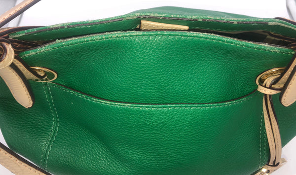 Pebbled Green Leather with contrasting Tan Leather Handles and Gold Toned hardware