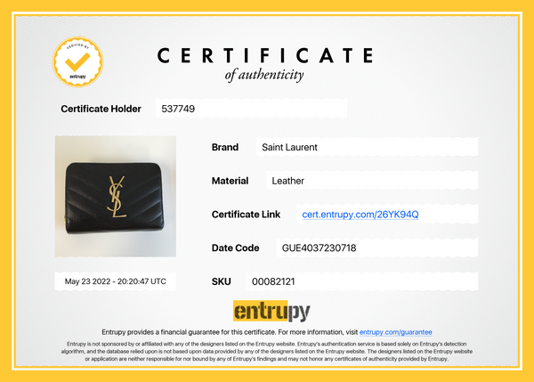 Entrupy Certificate of Authenticity, and Original YSL branded box